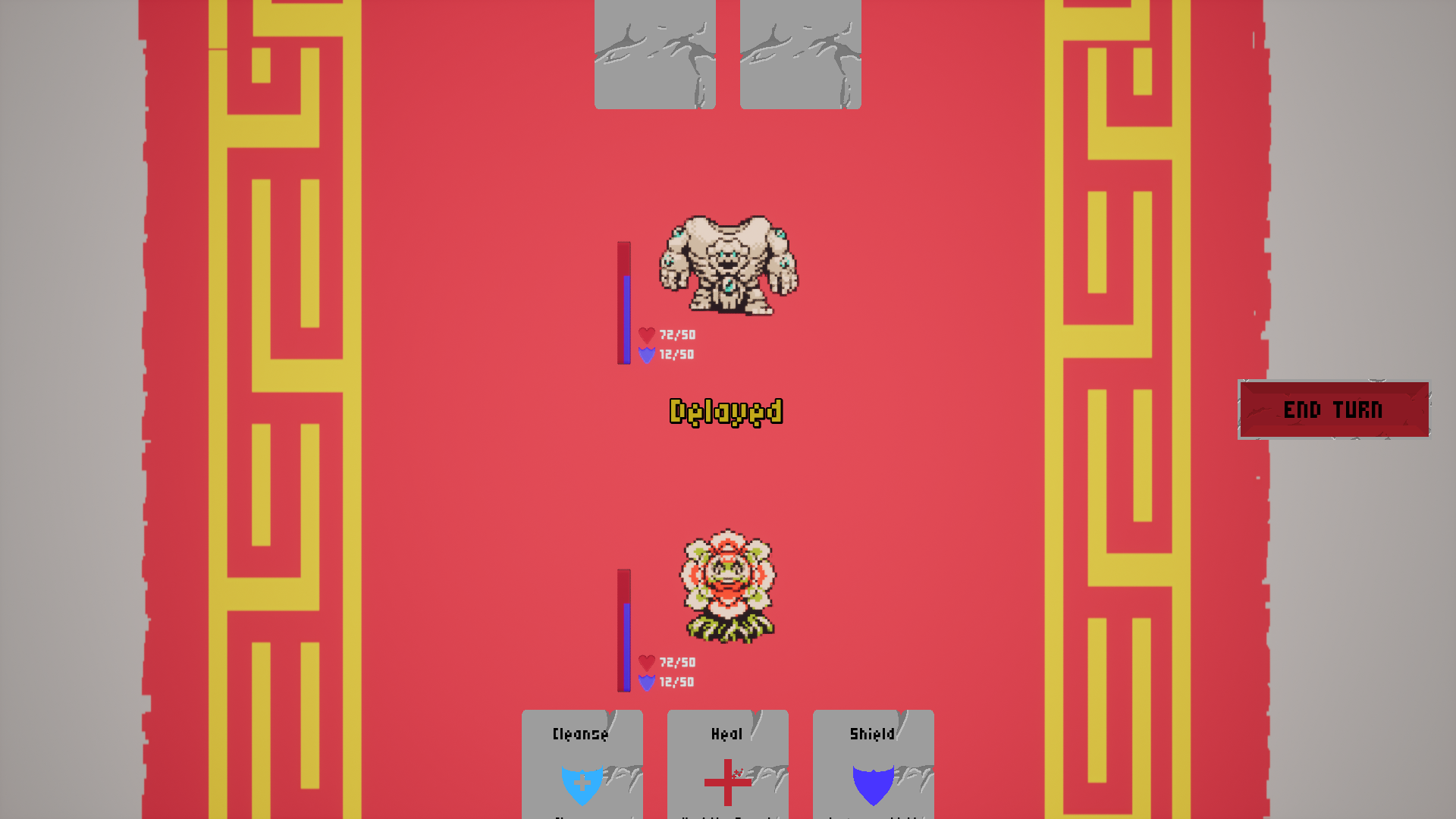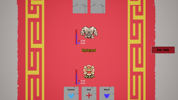 A turn based game where each card has specific effects. Time your cards with the target modifier to inflict maximum damage without accidentally damaging yourself or buffing your enemy.